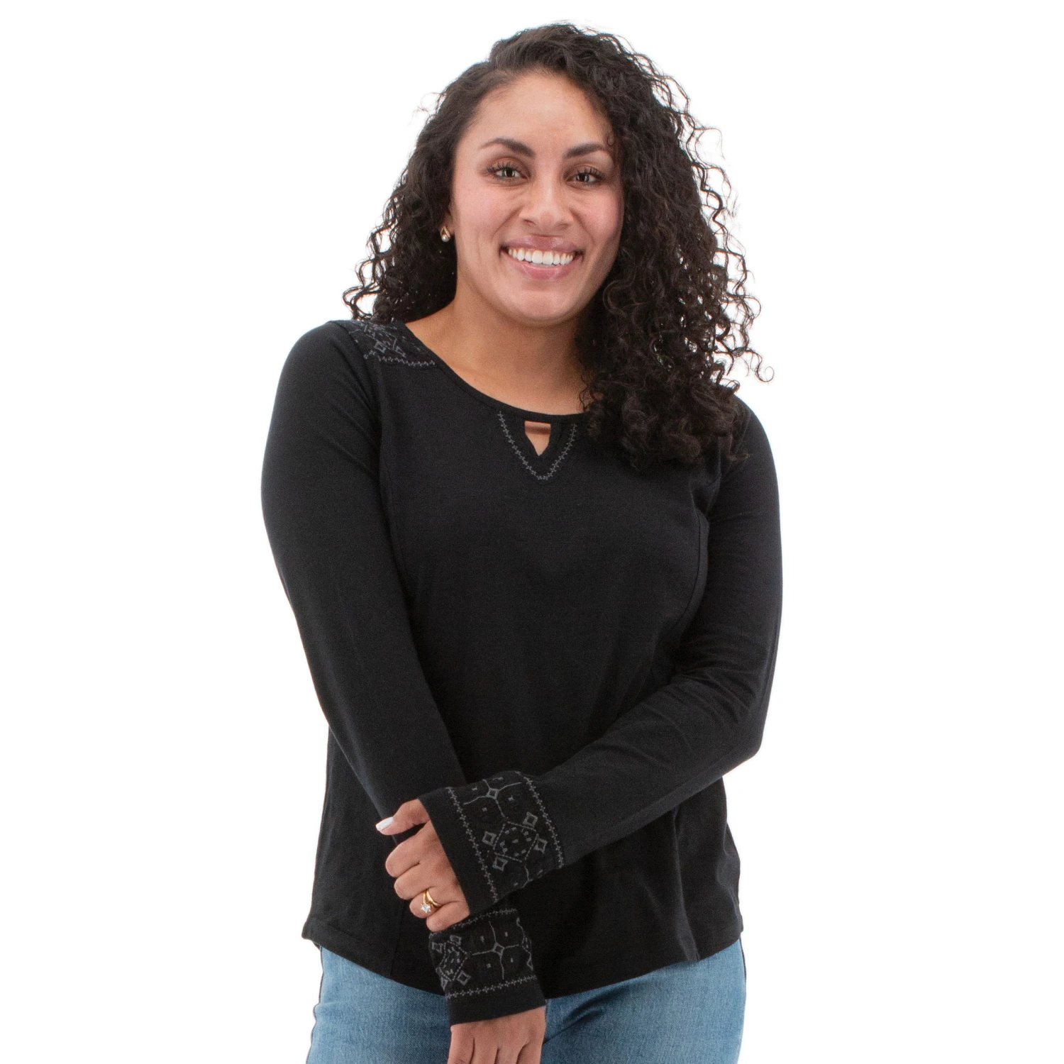 You will fall in love with the comfortable, silky fabric of the Addison Top made from a combination of TENCELâ„¢ Lyocell and organic cotton. Breathable, quick-drying, and strong, this sustainable jersey leaves a smaller footprint on the environment. Did we mention how well it drapes? The fabric is cut with princess seams at the side and a center seam at the back. This top is as flattering as it is comfortable. Enjoy pretty, feminine details such as the V-notch neck, tonal embroidery details, and a rounded shirttail.