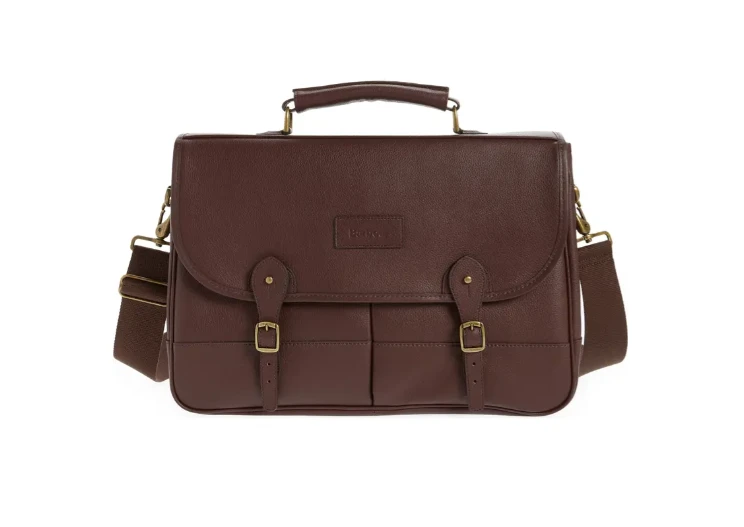 Hearty leather construction enriches a ruggedly styled briefcase featuring tough brass hardware and a spacious interior for versatile utility.