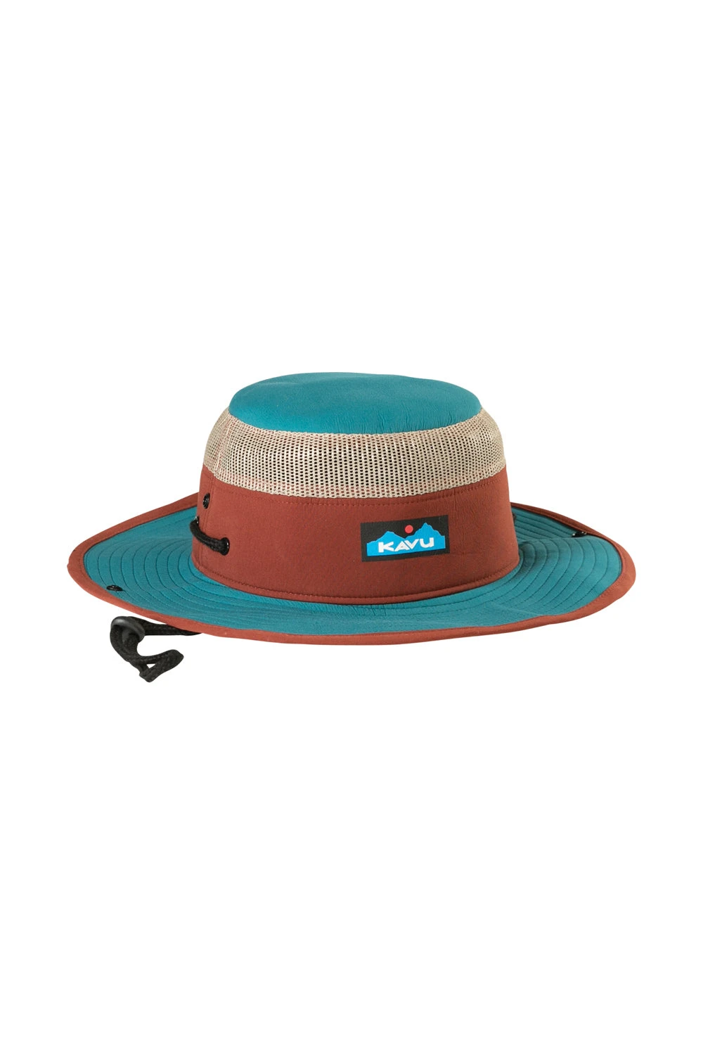 Polyester lined with closed cell foam boonie, mesh panel insert on crown, floppy brim that can snap to crown at sides, logo label at centre front, adjustable chinstrap with cord lock, metal mesh eyelets, interior taping and padded sweatband.