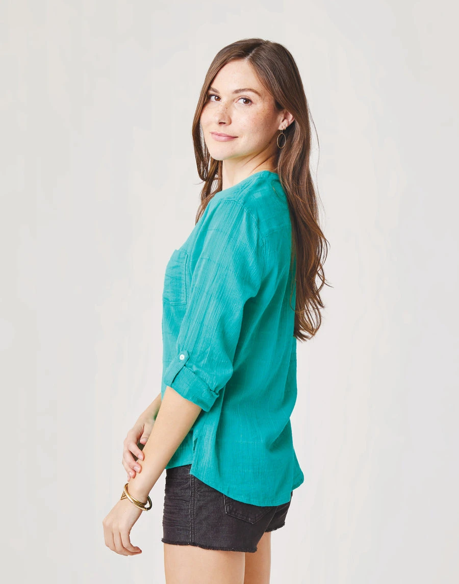 Simple sophistication make this lightweight summer top a weekend bag must. Chest pockets and three button open V-neck dial in the vibe in stride.