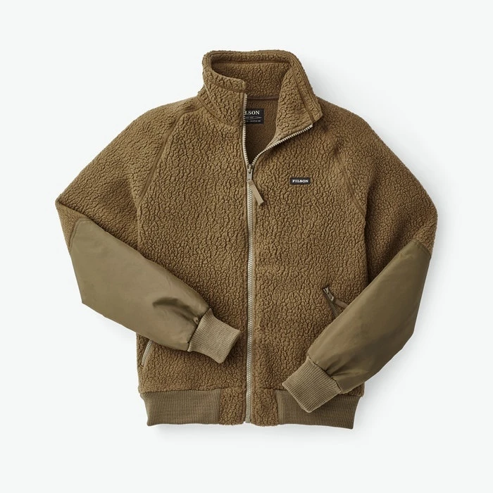 Add warmth without weight when you put on the Filson Sherpa Fleece Jacket. Made with Polartec Thermal Pro sherpa fleece, it has a high-pile that offers excellent thermal retention while being quick-drying and breathable. Features full-length zipper, four interior stow pockets, and nylon-reinforced forearms for added durability.