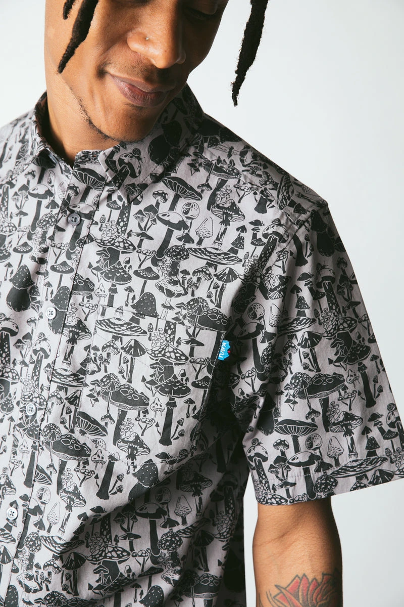 Party starter! Casual fit, short sleeve button up shirt, stand collar with interior logo jacquard tape, single chest pocket, dyed to match pearlized buttons with satin finish, back yoke panel with box pleat, curved hem.