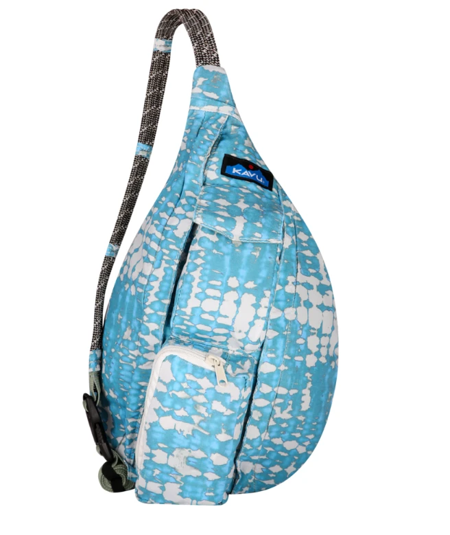 - Mini sling pack with adjustable rope shoulder strap and side release buckle, elastic webbing keeper at strap end, two key or cell phone pockets, padded back with KAVU embroidery