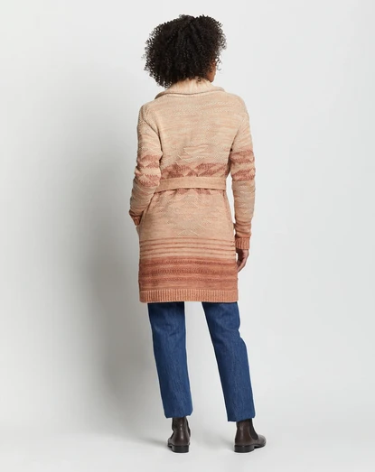 Women’s textured cotton cardigan in warm desert shades, with an open front, shawl collar, two pockets and an optional belt. Breathable, mid-weight 100% cotton makes this sweater a perfect choice any time of year.
