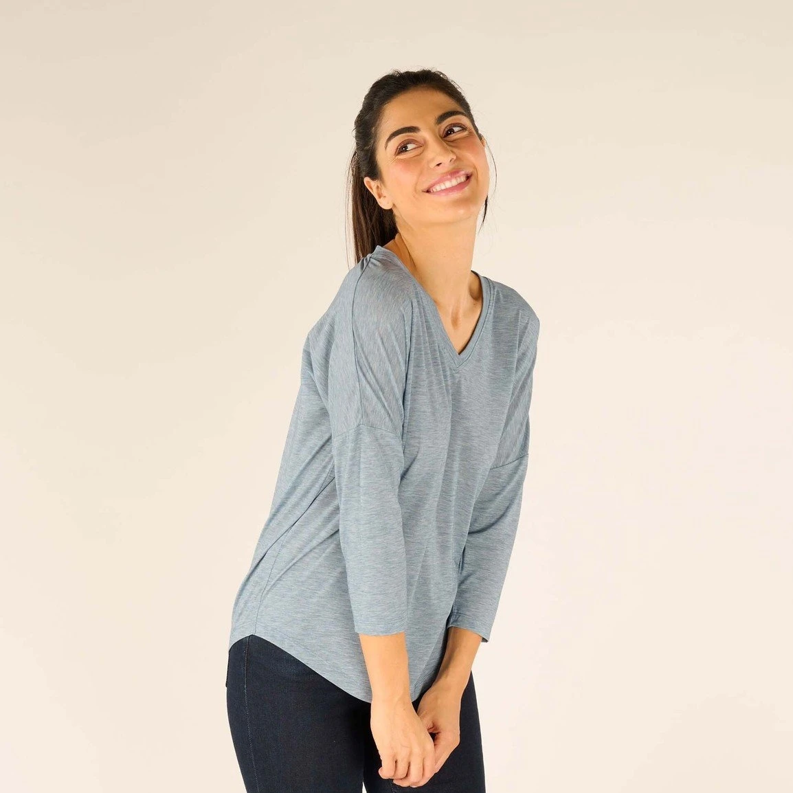 The Asha V-Neck ¾ Sleeve Top is the ultimate travel top, rich with sustainable fabric technology designed for all day comfort and performance. Made with Repreve® polyester, sourced from recycled plastic bottles, this tee is a true example of environmentally conscious clothing. Using drirelease® technology, the fabric helps to regulate body temperature, wicking excess moisture swiftly away from the skin, leaving the wearer dry and comfortable throughout the day. In addition, antimicrobial fabric treatment ensures a feeling of freshness, no matter how strenuous the activity. All this, along with being stain and wrinkle resistant, adds up to the Asha V-Neck ¾ Sleeve top being an undisputed travel essential.