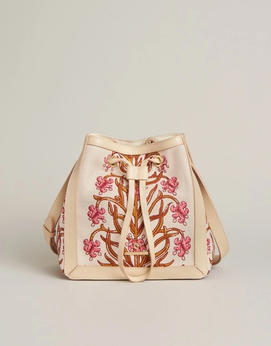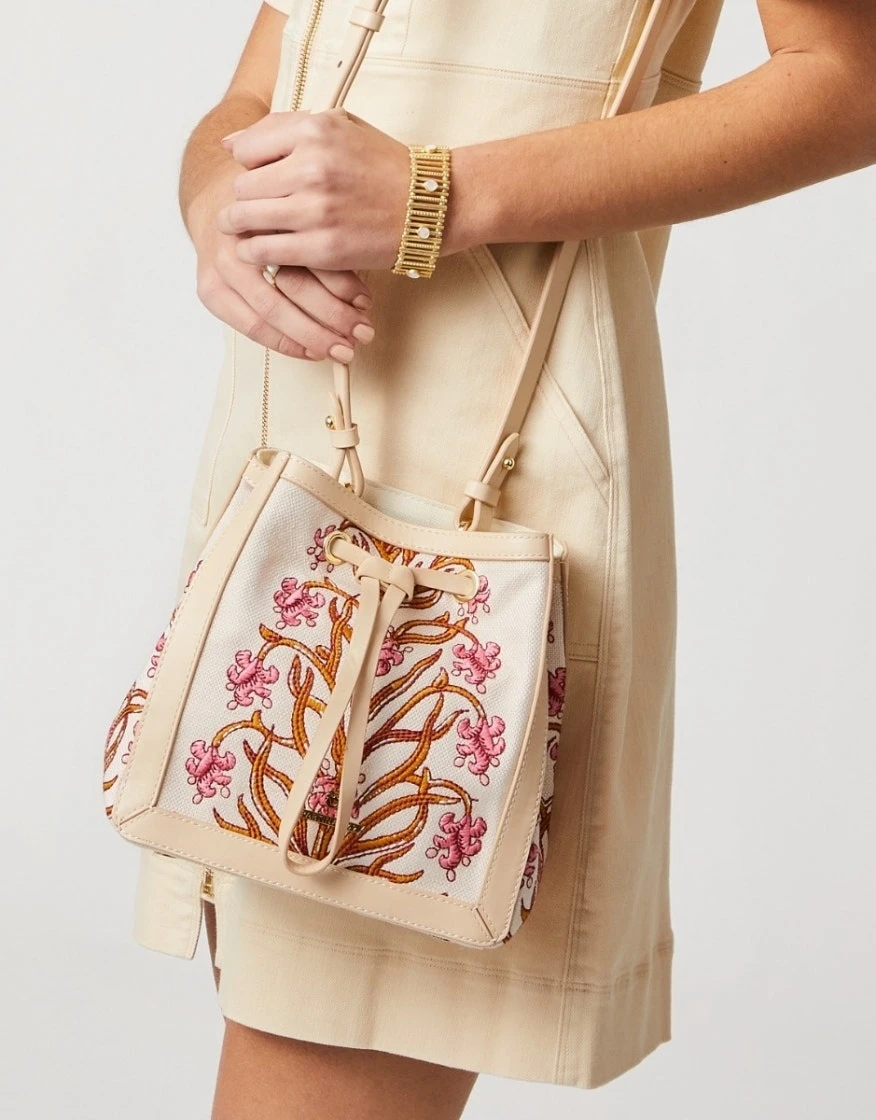 Meet the Natalie: she’s radiant in woodblock floral cotton jute, perfectly cinched with a Napa leather drawstring, and perfectly placed on your hip with an adjustable crossbody strap. Her linen interior features two slip pockets and a zip pocket.